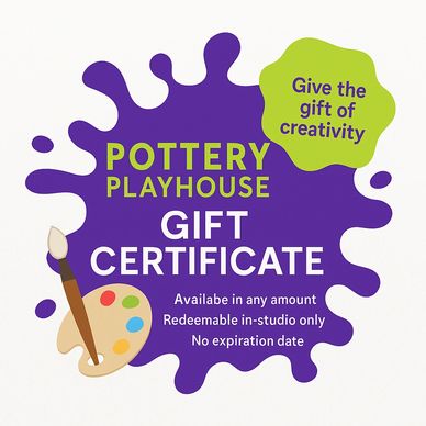 Our gift certificates are the perfect way to share the joy of Pottery Playhouse. Whether it’s for a birthday, holiday, teacher appreciation, or just because—this gift is always a hit!